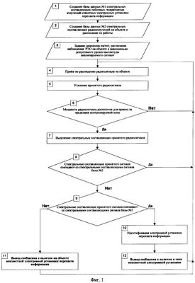 Возможность реализации заявленного способа объясняется следующим. Предварительно формируют базу данных №1 (п.1 фиг.1, п.6 фиг.2) о спектральных составляющих побочных генераторных излучений известных НУОЭУ перехвата информации, что обеспечивает в дальнейшем идентификацию типа обнаруженной НУОЭУ, и дополнительную базу данных №2 о спектральных составляющих радиоизлучений СУОЭУ (п.2 фиг.1, п.5 фиг.2). В базу данных №2 также включают данные о пороговых амплитудных значениях спектральных составляющих радиоизлучений и расписании работы СУОЭУ (п.3 фиг.1). Учет в базе данных №2 информации о спектральных составляющих радиоизлучений СУОЭУ, их пороговых амплитудных значениях и расписании работы обеспечивает исключение ложного реагирования на факты работы СУОЭУ в процессе обнаружения и идентификации НУОЭУ. Методы преобразования сигнала с целью формирования первичных признаков для решения задач распознавания сигналов описаны, например, в книгах: Алексеев А.А. и Кириллов А.Б. «Технический анализ сигналов и распознавание радиоизлучений». – СПб.: ВАС, 1998, с.24-31, Марпл – мл. С.Л. «Цифровой спектральный анализ и его приложения». – М.: Мир, 1990, с.43-67.