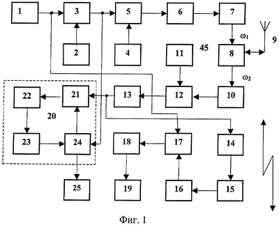 Одновременно напряжение третьей промежуточной частоты uпр3(t- з) (фиг.4,д) поступает на первый вход перемножителя 21, на второй вход которого подается сложный ФМн-сигнал u1(t) (фиг.4,в) с выхода фазового манипулятора 3 через блок 24 регулируемой задержки. Полученное на выходе перемножителя 21 напряжение пропускается через фильтр 22 нижних частот, на выходе которого формируется корреляционная функция R( ). Экстремальный регулятор 23, предназначенный для поддержания максимального значения корреляционной функции R( ), подключенный к выходу фильтра 22 нижних частот, воздействует на блок 24 регулируемой задержки и поддерживает вводимую им задержку равной з ( = з), что соответствует максимальному значению R( ). Указатель 25 дальности, связанный с блоком 24 регулируемой задержки, позволяет непосредственно считывать измеренное значение расстояния R между объектами: