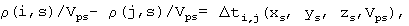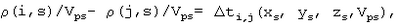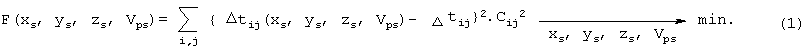 По регистрационным записям сейсмических сигналов определяется время задержки сейсмического сигнала между всеми парами точек наблюдения в скважине и точек сейсмической антенны. Время между парами точек наблюдения определяется как разница времен пробега от источника колебаний с координатами xs, ys, zs к двум точкам наблюдения одной с координатами одного из скважинных снарядов xi, yi, zi и другой с координатами приемников сейсмической антенны на дневной поверхности xj, yj, zj со скоростью распространения сейсмической (продольной или поперечной) волны Vps: