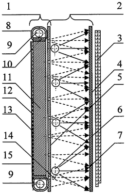 Цифрами обозначены: 1 – блок ночной подсветки, 2 – блок дневной подсветки, 3 – ЖКЯ с поляризаторами, 4 – пакет оптических пленок для формирования светового потока, 5 – отражатель с отверстиями, 6 – лампы дневной подсветки, 7 – световой поток в дневном режиме подсветки, 8 – отражатель ламп ночной подсветки, 9 – лампы ночной подсветки, 10 – ИК-светофильтр, 11 – светопроводный блок, 12 – распределенный отражатель, 13 – сплошной отражатель, 14 – световой поток в ночном режиме работы, 15 – корпус модуля подсветки.