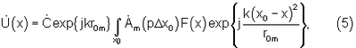 где – комплексная константа; r0m – расстояние до m-го элемента разрешения по дальности в момент времени Тс/2; – функция, описывающая вдоль оси х0 рассеивающие свойства поверхности объекта, находящейся в m-м элементе разрешения по дальности; – количество элементов разрешения по линейной угловой координате, перекрывающих максимальный линейный размер объема x0mах по координате х0; – линейная угловая разрешающая способность синтезированной апертуры вдоль оси х0 [3, стр.31], F(x) – множитель, определяемый направленными свойствами совокупности Q элементов Z-элементной антенны 1.