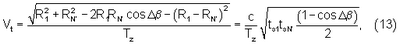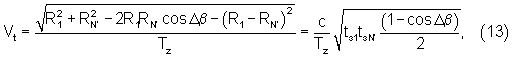 По вычисленным величинам  и tз1, tзN в блоке определения тангенциальной скорости 37 рассчитывается значение тангенциальной скорости Vt объекта по формуле (из теоремы косинусов)