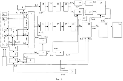 Принятые Z-элементной антенной 1 сигналы через первый сумматор 4 поступают на первом входе третьего смесителя 11, полосовой фильтр 16, ОФ ШПС 14, в которых осуществляется обработка, аналогичная обработке принятых Q элементами Z-элементной антенны 1 сигналов во втором смесителе 12, полосовом фильтре 17, ОФ ШПС 15 за счет соответствия их параметров. Сигналы с выхода ОФ ШПС 14 поступают на детектор огибающей 27, где формируется дальностный портрет объекта, оцифровываются в аналого-цифровом преобразователе 25 и поступают на первый вход блока расчета восстанавливающей волны 28.