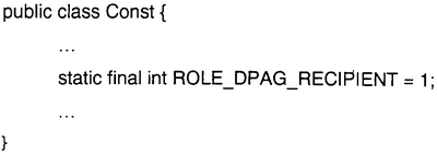 Это приводит к предпочтительному варианту выполнения настоящего изобретения, а именно использованию роли пользователя в объекте в качестве атрибута. Роль задается как int (целое). В классе Const задаются выразительные имена переменных, например: