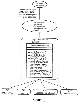 На фиг.1 показана структура компонентов. Синтаксический анализатор языка XML осуществляет преобразование XML файлов, которые посылаются посредством HTTP, в вызовы функциональных процедур, которые могут быть интерпретированы логистической системой класса Machine Interface (Машинный Интерфейс), оценивает вызовы функциональных процедур и перенаправляет их подходящим компонентам, а именно, компонентам User (Пользователь), Parcel (Посылка), DeliveryMachine (Доставочная Машина) и Notification (Уведомление).