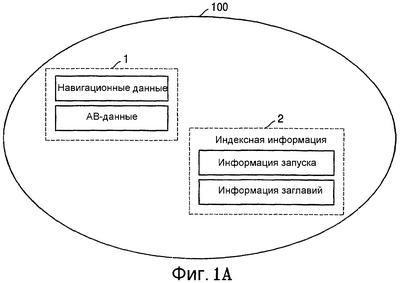 Согласно фиг.1А, на диске 100 сохранены данные 1 основного режима и индексная информация 2. Данные 1 основного режима содержат аудио/видео (АВ) данные, которые включают в себя множество заглавий, и навигационные данные, которые имеют множество навигационных команд для навигации по АВ-данным, подобно обычному цифровому видеодиску (DVD-видеодиску). Структура и данные основного режима удовлетворяют требованиям и стандартам на DVD-видеодиски.