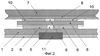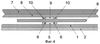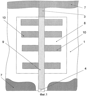 Другой пример конкретной реализации предложенного устройства (см. Фиг.3, 4) содержит плату в виде пластины 1 из диэлектрического материала, на нижней стороне которой расположен электропроводный экран 2, а на верхней стороне – входная микрополосковая линия 3 из электропроводного материала и короткозамыкатель 4 из электропроводного материала, поглощающий слой 5 из резистивного материала (например, поглощающего энергию СВЧ-электромагнитных колебаний) с подключенными параллельно элементами 6 из электропроводного материала, причем поглощающий слой 5 гальванически включен между входной микрополосковой линией 3 и короткозамыкателем 4, а также содержит дополнительный электропроводный экран 7, причем над платой в виде пластины 1 размещено с зазором друг над другом N, где N – натуральный ряд чисел, дополнительных пластин 8 из диэлектрического материала с коэффициентом теплопроводности больше, чем коэффициент теплопроводности материала платы 1 (например, две пластины (N=2), при этом N ограничено таким образом, чтобы высота всех пластин не превысила ширину устройства), а также между N дополнительными пластинами N-1 дополнительных поглощающих слоев 9 из резистивного материала (например, один слой (N-1=1)) с подключенными параллельно дополнительными элементами 10 из электропроводного материала, гальванически включенных между входной микрополосковой линией 3 и короткозамыкателем 4, причем все поглощающие слои 5, 9 с подключенными параллельно элементами 6, 10 расположены в зазорах между пластинами 1, 8, причем расположенные в зазорах элементы 6, 10 выполнены прерывистыми (например, каждый элемент выполнен в виде прерывистой полосы, величина прерываний и ширина полосы менее ширины микрополосковой линии 3 и уменьшаются в направлении от концов (микрополосковой линии 3, короткозамыкателя 4) к середине устройства) и примыкающими к боковым кромкам поглощающих слоев 5, 9, элементы 6, 10 выполнены из электропроводного материала с температурой плавления ниже, чем температуры плавления резистивного материала и электропроводного материала микрополосковой линии 3 и короткозамыкателя 4, причем дополнительный электропроводный экран 7 выполнен нанесенным на верхнюю поверхность N-й дополнительной пластины из диэлектрического материала (например, второй пластины) и имеет толщину и теплоемкость более толщины и теплоемкости N-й дополнительной пластины из диэлектрического материала.
