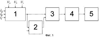 На входы блока 1 подаются напряжения фаз сети, измеренные относительно нейтрали, и фазные токи конкретной линии. В блоке 1 выделяют пульсирующую мощность путем измерения или вычисления мгновенной мощности трех фаз линии и одновременно ее среднего значения и затем вычитания из мгновенной мощности средней мощности по формулам [10]: