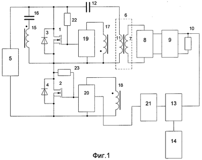 1 – первый транзисторный ключ, 2 – второй транзисторный ключ, 3 и 4 – антипараллельные диоды, 5 – первичный источник питания, 6 – силовой трансформатор, 7 – выходная обмотка силового трансформатора, 8 – выпрямитель, 9 – сглаживающий фильтр, 10 – нагрузка, 11 – первичная обмотка силового трансформатора, 12 – фильтрующий конденсатор, 13 – усилитель сигнала рассогласования, 14 – источник опорного напряжения, 15 – первичная обмотка задающего трансформатора, 16 – развязывающий конденсатор, 17 – первая вторичная обмотка задающего трансформатора, 18 – вторая вторичная обмотка задающего трансформатора, 19 – первый формирователь, 20 – второй формирователь, 21 – элемент гальванической развязки, 22 и 23 – пусковые резисторы.