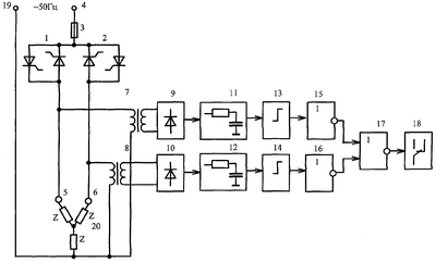 Объединенные выводы двух пар встречно-параллельно включенных тиристоров 1 и 2 через предохранитель 3 соединены с клеммой 4 для подключения питающего однофазного напряжения переменного тока, другие выводы пар соединены с клеммами 5, 6 для подключения нагрузки и первыми выводами трансформаторов 7, 8, нагруженными на выпрямители 9, 10. Выходы выпрямителей 9, 10 соединены через LC-фильтры 11, 12 с входами пороговых элементов 13, 14, выходы которых через инверторы 15, 16 подключены к входам элемента ИЛИ-НЕ 17. Вторые выводы трансформаторов подключены к другой клемме для питающего напряжения 19. Вместо предохранителя 3 может быть использовано тепловое реле или автоматический выключатель с тепловым расцепителем.