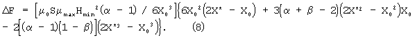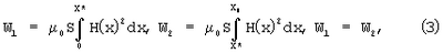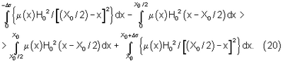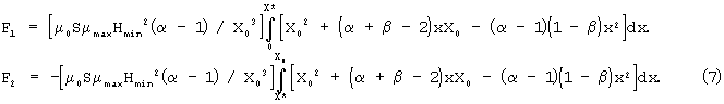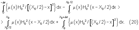 определяющее выполнение неравенства F>0, что вытекает из симметричности распределения магнитного поля Н(х) относительно центра тяготения магнитного поля х=Х0/2, равенства интервалов интегрирования и сильной асимметричности распределения (х) из-за влияния магнитной вязкости ферромагнетика и его свойства изменять свою относительную магнитную проницаемость в функции напряженности действующего на него магнитного поля, и поэтому равнодействующая сила F определяется с точностью до постоянного множителя разностью пар определенных интегралов, указанных в неравенстве (20).