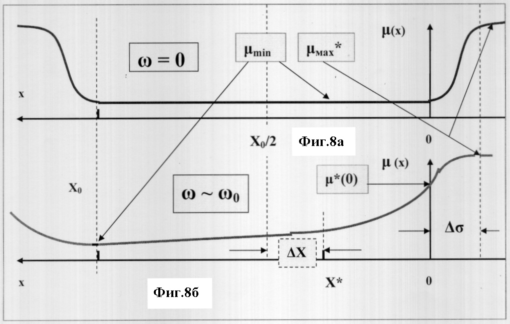 На фиг.8а представлен график функции (х) при неподвижном ферромагнитном диске (кольце) при =0, а на фиг.8б – график (х) при условии вращения ферритового диска (кольца) с угловой скоростью = 0, согласующейся с постоянной релаксации магнитовязкого ферромагнетика с учетом (1).