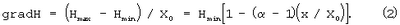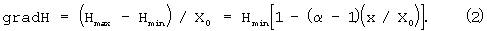 с учетом заданного распределения напряженности магнитного поля вдоль координаты х интегрирования, например, линейного с градиентом gradH(х)= H/ x=(Hmax-Hmin)/X0 с крутизной =Hmax/Hmin>1, где минимальная напряженность магнитного поля Нmin соответствует координате х=0, а максимальная Нmax – координате х=Х0. Вычислив интегралы (3), находим относительную величину центра тяготения магнитной системы по формуле: