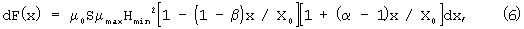 С учетом неоднородности магнитного поля Н(х)=Нmin[1+( -1)х/Х0] и неоднородности относительной магнитной проницаемости ферромагнитного вещества, находящегося в магнитном зазоре с неоднородным магнитным полем, [H(x)]= (х)= max[1-(1- )х/Х0], где max – начальное значение относительной магнитной проницаемости ферритового вещества в начале магнитного зазора при х=0, для дифференциала силы dF(x), действующей на заданный дифференциальный объем ферромагнитного вещества dv со стороны магнитного поля, согласно (5) и с учетом того, что имеем ферромагнитное вещество, для которого (Н) в заданном диапазоне напряженностей магнитного поля существенно больше единицы, что позволяет в расчетах, вместо -1, использовать величину , получаем общее выражение: