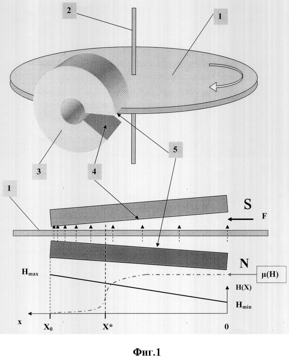 На фиг.1 приведено одно из возможных конструктивных решений поставленной задачи. Устройство состоит из ферромагнитного диска 1 с осью его вращения 2, краевая часть диска помещена в магнитный зазор постоянного магнита 3, образованный между полюсами 4 и 5 магнита. При этом рассматривается вариант неоднородного магнитного поля в зазоре. Ниже на фиг.1 изображена схема взаимного расположения части ферромагнитного диска 1 в магнитном зазоре между полюсами 4 и 5 магнита 3, которые развернуты друг по отношению к другу на некоторый угол, в результате чего в зазоре образуется неоднородное магнитное поле Н(х), изменение которого вдоль оси х показано на графике внизу фиг.1. Штрих-пунктирной линией на этом графике показано изменение магнитной восприимчивости J(x) в статике, как если бы диск 1 не вращался, обусловленное действием на ферромагнетик разного по напряженности магнитного поля.