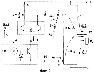 Дифференциальный усилитель фиг.2 содержит входной дифференциальный каскад 1, общая эмиттерная цепь которого 2 соединена с коллекторным выходом 3 токового зеркала 4. Первый выход 5 входного дифференциального каскада 1 связан с первым токовым входом 7 дополнительного сумматора токов 8, а второй токовый вход 9 дополнительного сумматора токов 8 подключен к эмиттерному выходу 10 токового зеркала 4.