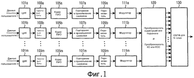 Затем, чтобы согласовать количество выходных сигналов FEC-кодера 105a с количеством символов модуляции, назначенных каждому пользователю, часть 107a прокалывания (перфорирования, удаления) и повторения символов выполняет повторение символа и перфорирование в отношении FEC-кодированных данных. Символы, которые подверглись повторению и прокалыванию, подают на канальный перемежитель 109a для преобразования пакета ошибок, встречающегося в канале, в случайную ошибку, и канальный перемежитель 109a выполняет канальное перемежение входных символов. Символы с канальным перемежением подают на модулятор 111а, и модулятор 111а модулирует символы с канальным перемежением. Модулированные символы подают на преобразователь 120 поднесущей или подканала и преобразователь NOS или NOOS. Преобразователь 120 поднесущей или подканала и преобразователь NOS или NOOS выполняют отображение (преобразование) поднесущей или подканала, и отображение (преобразование) NOS (количество слотов, КС) или NOOS (количество OFDM символов, КОС) в модулированные символы в течение продолжительности передачи, распределенной каждому пользователю. Преобразователь 120 поднесущей или подканала и преобразователь NOS или NOOS одновременно обрабатывают данные для всех пользователей. Вывод символов из преобразователя 120 поднесущей или подканала и преобразователя NOS или NOOS подают на блок 130 обратного быстрого преобразования Фурье (IFFT, ОБПФ), и блок 130 IFFT выполняет обратное быстрое преобразование Фурье над входными символами. Таким образом, данные для каждого пользователя преобразуются в один несущий сигнал и подаются на радиочастотный (РЧ) модуль (не показан).