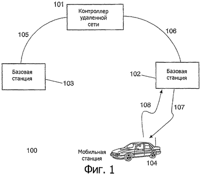 Рассмотрим фигуру 1, на которой представлена часть системы (100) мобильной связи WCDMA. В отличие от настоящего изобретения, элементы, показанные на чертеже, являются хорошо известными и не будут подробно описаны. При этом базовая станция 102 включает процессоры, запоминающее устройство, карты интерфейса и установленные программные приложения. На чертеже показаны RNC, контроллер удаленной сети 101, который помимо других функций выполняет вызовы; две базовые станции: 102, 103; и одна мобильная станция 104, которая представлена изображением автомобиля. Две базовые станции и мобильная станция представляют конечные точки беспроводного интерфейса. Каждая базовая станция должна быть ассоциирована с одним RNC 101 через наземные линии 105 и 108. В дальнейшем предполагается, что мобильная станция 104 связана с базовой станцией 102 через сигнал 107 от базовой станции к абоненту и сигнал 108 от абонента к базовой станции.