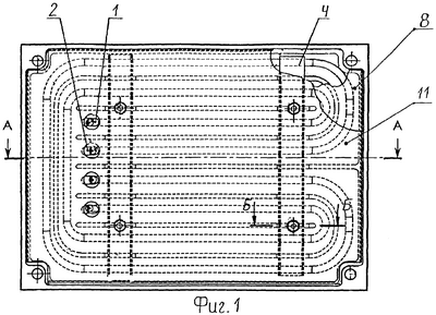 1. На нижнюю поверхность плиты 3 между ребрами жесткости 6 выкладываются ТЭНы 1, 2.