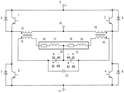 На чертеже приведена электрическая схема предлагаемого устройства для индукционного нагрева. Оно содержит четыре полностью управляемых вентиля 1, 2, 3, 4, например транзистора, соединенных по мостовой схеме и четыре диода 5, 6, 7, 8, при этом вентильный мост имеет диагональ постоянного тока, которая подсоединена к источнику питания постоянного напряжения 9, 11 таким образом, чтобы управляемые вентили 1, 2, 3, 4 были включены в прямом направлении по отношению к полярности источника питания постоянного напряжения, а каждый управляемый вентиль 1, 2, 3, 4 зашунтирован соответственно встречно включенным диодом 5, 6, 7, 8. К диагонали переменного тока вентильного моста подсоединены последовательно соединенные первичные обмотки 12, 13 двух трансформаторов, причем общая точка этих обмоток соединена с нулевым выводом 10 источника питания постоянного напряжения. Вторичные обмотки 14, 15 упомянутых трансформаторов подключены каждая к первой и второй последовательным RLC-цепям, а именно первая вторичная обмотка 14 подсоединена к последовательной RLC-цепи 16, 17, 20, а вторая вторичная обмотка 15 – к последовательной RLC-цепи 18, 19, 21, а первая 16, 17 и вторая 18, 19 RL-цепи соединены последовательно между собой и образуют активно-индуктивную нагрузку-индуктор из двух полуобмоток, который крайними выводами подсоединен к первым выводам вторичных обмоток 14, 15 трансформаторов. Первый конденсатор 20 и второй конденсатор 21 соединены последовательно между собой и общей точкой последовательной цепи подсоединены к общей промежуточной точке полуобмоток 16, 17 и 18, 19 нагрузки-индуктора, а крайними выводами этой цепи подсоединены к вторым выводам вторичных обмоток 14, 15 трансформаторов. К этим же выводам подсоединен и третий конденсатор 22.