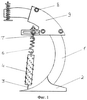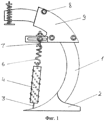 Известно устройство (а.с. СССР №536768, А01В 35/26, 1976), состоящее из стойки, рыхлительной лапы и расположенного перед стойкой гибкого элемента типа струны. Один конец гибкого элемента присоединен к лапе, а другой – к расположенному на стойке кронштейну через пружину и регулировочный винт с гайкой.