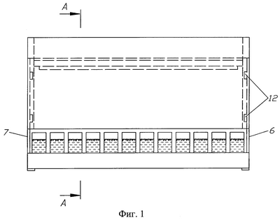 При этом работающая в автоматическом режиме электрическая кабельная нагревательная система поддерживает запрограммированную температуру питательной среды в растильнях 4, контроль и управление обеспечивается электронным терморегулятором (не показан), а текущее измерение функционального параметра производится датчиком температуры 3. При снижении или повышении температуры происходит автоматическое включение или отключение нагревательного элемента 2 соответственно. При этом основная часть выделенной теплоты нагревательным элементом 2 подводилась к питательной среде, за счет того, что основание 1 защищено теплоизоляционным кожухом 5.