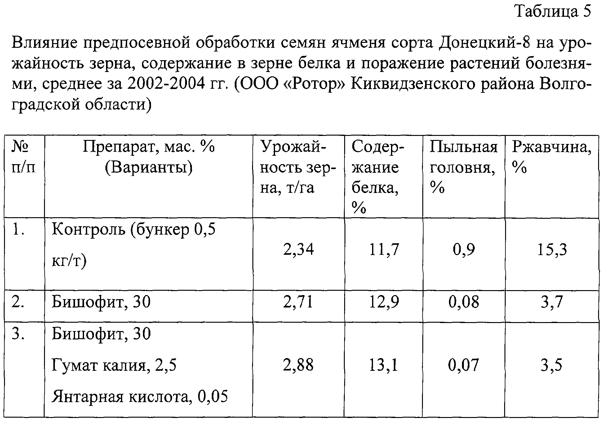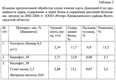 Эффективность данного средства проверялась на озимой пшенице сорта Дон-93. В условиях Волгоградской области полученные результаты в полевых условиях представлены в таблице 3. Установление оптимальных концентраций предлагаемых препаратов для композиционных смесей в чашках Петри показало, что при обработке семян озимой пшеницы сорта Дон-93 бишофитом 35 мас. % концентрации энергия прорастания составила 87,8; а всхожесть – 90,1%. Длина растения при этом была 10,7, а длина главного корня – 3,3 см при массе 10 растений – 1,51 г. Обработка семян композиционной смесью: бишофит, 35 мас. %, янтарная кислота, 0,05 мас. % и НК 0,01 мас. % – увеличивает эти показатели до, соответственно, 89,5 и 91,2%, 11,2 3,6 см и 1,74 г. В данный препарат, кроме описанных, введена янтарная кислота. Янтарная кислота – этан-1,2-дикарбоновая кислота формулы С4Н6O4. Янтарная кислота увеличивает полевую всхожесть, укоряет появление всходов на два-три дня, усиливает процессы роста, ускоряет созревание на 5-6 дней и повышает урожай зерна. Пример 4. Рассмотрим эффективность предложенного средства по четвертому варианту в следующем составе, мас. %: