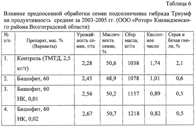 Это средство проверено в производственных условиях при возделывании подсолнечника гибрида Триумф. Обработка семян и проращивание их в чашках Петри на гибриде подсолнечника Триумф показала, что при обработке семян раствором бишофита 60 мас. % концентрации энергия прорастания семян составила 94,8, а всхожесть – 95,5%. Длина растения при этом составляла 13,0 см, длина главного корня – 9,5 см, а масса 10 растений – 10,01 г. Обработка семян композиционной смесью, состоящей из бишофита 60 мас. % и НК 0,02 мас. % увеличивает эти показатели, соответственно, до 95,1 и 96,0%, 13,5 и 9,8 см, 10,54 г. Результаты цифровыми данными описаны в таблице 6. Таким образом, указанный выше технический результат достигается также тем, что в способе получения предпосевной композиции последовательно подбирается концентрация раствора бишофита в зависимости от качества семян, которая назначается по лучшей энергии прорастания и всхожести семян, длине корней и проростка, а также самой массе проростка. Дозу расхода гумата калия и силка назначают аналогичным образом, что и для бишофита, только на фоне назначенной концентрации бишофита. Янтарную кислоту, никотиновую кислоту, силк и гумат калия растворяют в рекомендуемой норме воды, в которую затем добавляют бишофит и перемешивают. Обработку семян сельскохозяйственных культур проводят перед посевом из расчета 10 литров на одну тонну семян. Эффективность предпосевной обработки семян кукурузы на зерно представлена в таблице 1, подсолнечника – в таблице 2, озимой пшеницы – в таблице 3 и проса – в таблице 4, других культур – в таблицах 5 и 6. Предпосевная обработка семян баковыми смесями биорациональных средств, как показывают данные таблиц 1-6, способствует улучшению качества полученной продукции, при одновременном улучшении фитосанитарной обстановки в посевах. Представленные сведения убедительно доказывают полученный положительный результат при достижении поставленной технической задачи. Нами в качестве стимулятора роста применен природный экологически чистый минерал бишофит в смеси с витамином никотиновой кислоты и широко применяемыми стимуляторами роста – гуматом калия, силком, янтарной кислотой и никфаном.