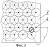 На фиг.3 показана часть электрода в увеличенном масштабе, где изображено взаимное расположение игл – каждая игла равноудалена от соседних игл на расстояние 25…30 мм, поскольку располагается в вершинах смежных треугольников с углом при вершине 60°, при этом достигается наиболее полное и равномерное распределение зон экранирования, показанных на фиг.3 в виде касающихся друг друга окружностей. Число игл для каждого электрода составляет порядка 190…200 шт. в зависимости от производительности установки.
