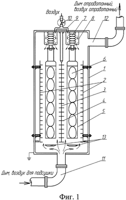 Куриные яйца моют, подвергают термической обработке, для чего их помещают в кипящую воду и варят при температуре 100°С в течение 15…20 мин для завершения денатурации белка («вкрутую»), после чего яйца охлаждают, очищают от скорлупы, затем помещают в 5…7%-ный раствор пищевой поваренной соли на 3…4 часа при температуре 10…15°С. Затем яйца укладывают в держатели, закрывают крышку и держатели помещают в коптильную камеру, прикрепляя их к изоляторам, и осуществляют предварительное подсушивание поверхности яиц воздухом с температурой 50…60°С в течение 2…3 минут, причем теплый воздух подают в коптильную камеру по входному трубопроводу 11, а отработанный воздух удаляют по трубопроводу 12.