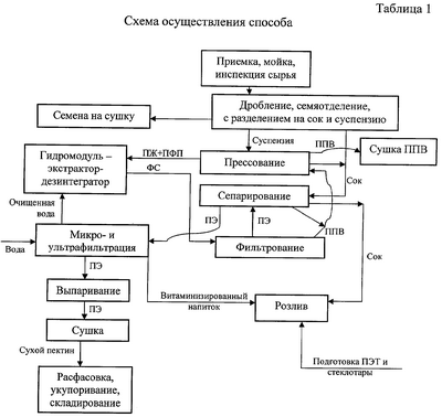 Это достигается тем, что в предлагаемом способе из сырья после дробления и прессования извлекают семена, сок и жом (ПЖ); создают гидромодуль при рН 2,8-3,6, путем смешивания очищенной микрофильтрацией (размер пор 0,6-1 мкм) и ультрафильтрацией (размер пор 0,01-0,1 мкм) через мембраны БТМ05/2 ЛП-Ф, БТМ05/2 ЛП-ПС при скорости протока и давлении пектинового экстракта соответственно 0,1-2,5 м/с и 0,1 МПа воды, жома и пульпы (ПФП) в соотношении жом:(вода + пульпа) от 50:50 до 15:85 и вода : пульпа от 90:10 до 75:25 массовых %; из гидромодуля извлекают ферментированную смесь (ФС); ФС разделяют на пищевые волокна (ППВ) и пектиновый экстракт (ПЭ) вакуум-фильтрованием и сепарированием; пищевые волокна прессуют с отделением пульпы, которую направляют в гидромодуль и обезвоживают конвективной сушкой при температурах сушильного агента 115-145°С и продукта 75-85°С; из пектинового экстракта извлекают пектиносодержащий витаминизированный напиток микро- и ультрафильтрацией; упаренный пектиновый экстракт обезвоживают вакуумной сушкой во вспененном состоянии при инфракрасном энергоподводе, температуре продукта 40-50°С и остаточном давлении в сушильной камере 2,7-5,5 МПа.