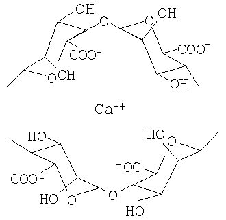 При взаимодействии с ионами кальция и другими поливалентными металлами золь альгината натрия переходит в гель. Пространственная сетка геля образуется за счет взаимодействия ионов кальция с карбоксильными группами полисахарида и дополнительно стабилизована координационными связями между ионами кальция и гидроксильными группами преимущественно остатков гулуроновой кислоты, что изображено в виде формулы: