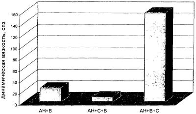 Экспериментальным путем определено, что необходимый эффект достигается при определенном порядке внесения компонентов. Так, смешивание компонентов в последовательности: альгинат натрия – сыворотка – вода (АН+С+В) приводит к снижению вязкости за счет перехода растворимого альгината натрия в нерастворимый альгинат кальция в условиях избытка ионов кальция. Смешивание компонентов в последовательности: альгинат натрия – вода – сыворотка (АН+В+С), при условии постепенного добавления сыворотки в раствор альгината натрия приводит к значительному повышению вязкости вследствие образования альгинатного геля (см. чертеж).