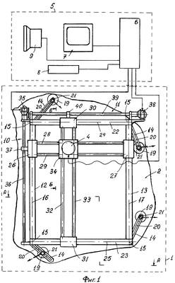 На каждой направляющей 12 и 13 первой пары установлен с возможностью продольного перемещения соответствующий ей ползун 26 и 27. Ползуны 26 и 27 жестко соединены между собой двумя стержнями 28 и 29, оси которых лежат в плоскости, параллельной плоскости, проходящей через оси 16 и 17. Аналогична на каждой направляющей 22 и 23 второй пары направляющих установлен, с возможностью продольного перемещения, соответствующий ей ползун 30 и 31. Ползуны 30 и 31 жестко соединены между собой двумя стержнями 32 и 33, оси которых также лежат в плоскости, параллельной плоскости, проходящей через оси 16 и 17. Рабочий инструмент 3 с исполнительным механизмом 4 (или лазер) закреплены на каретке 34, которая установлена на расположенных ортогонально относительно друг друга двух парах стержней 28, 29, 32 и 33 с возможностью продольного относительно каждой пары стержней 28, 29 и 32, 33 перемещения. Для этого в каретке 34 выполнены две пары параллельных между собой сквозных отверстий соответственно для пары стержней 28 и 29 и для другой пары стержней 32 и 33. Исполнительный механизм 10 для перемещения по первой координате выполнен аналогично тому, как описано в прототипе, а именно в виде винтового механизма (фиг.1), содержащего закрепленные на направляющей 12 (или 13) неподвижно электродвигатель 35 и винт 36 с гайкой 37 с возможностью вращения винта 36 вокруг своей оси, параллельной направляющей 12, при этом вал электродвигателя 35 соединен, например, через редуктор с винтом 36, а гайка 37 (выход механический исполнительного механизма 10) соединена жестко с ползуном 26. Управляющий вход электродвигателя 35 является управляющим входом исполнительного механизма 10 для перемещения по первой координате. Аналогично исполнительный механизм 11 для перемещения по второй координате выполнен в виде закрепленных на направляющей 22 (или 23) неподвижно электродвигателя 36 и с возможностью вращения вокруг своей оси, параллельной направляющей 22, винта 39 с гайкой 40, при этом вал электродвигателя 38 соединен, например, через редуктор с винтом 39, а гайка 40 (выход механический исполнительного механизма 11) жестко соединена с ползуном 30. Управляющий вход электродвигателя 38 является управляющим входом исполнительного механизма 11 для перемещения по второй координате. В принципе исполнительные механизмы 10 и 11 для перемещения по взаимно перпендикулярным координатам могут иметь и другое конструктивное выполнение, например, в виде шагового электродвигателя (см. авторское свидетельство SU – А – №383632, 1971) или в виде бесконечной ленты (тросика), закрепленной на двух шкивах, как описано в патенте RU – C1 – №2106918, 1998.