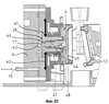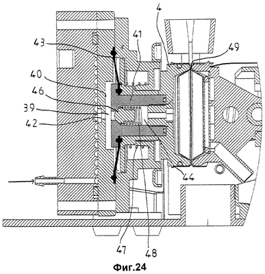 Как показано на фиг.23 и 24, поршень гидроцилиндра 38 образован подвижным органом 41, жестко связанным с вращающейся частью 4 камеры, с возможностью обеспечения ее продвижения или отвода в соответствии с рабочим положением гидроцилиндра 38. Жидкость под давлением (в частности, горячая вода из бойлера 9) поступает в камеру 39 для осуществления давления на подвижный орган 41. Камера 39 образована между подвижным органом 41 и поверхностью 40 бойлера 9, при этом поверхность 40 предпочтительно имеет небольшую полость, обеспечивающую образование достаточного объема для камеры 39.