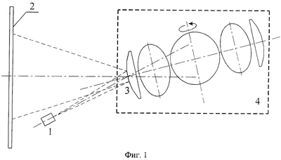 Между лазером 1 и диффузно рассеивающим экраном 2 установлены несколько отражателей 3 с криволинейной отражающей поверхностью (сферических зеркал), которые перемещаются относительно пучка лазерного излучения таким образом, что в любой момент времени излучение лазера направлено на отражающую поверхность, по крайней мере, одного отражателя.