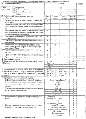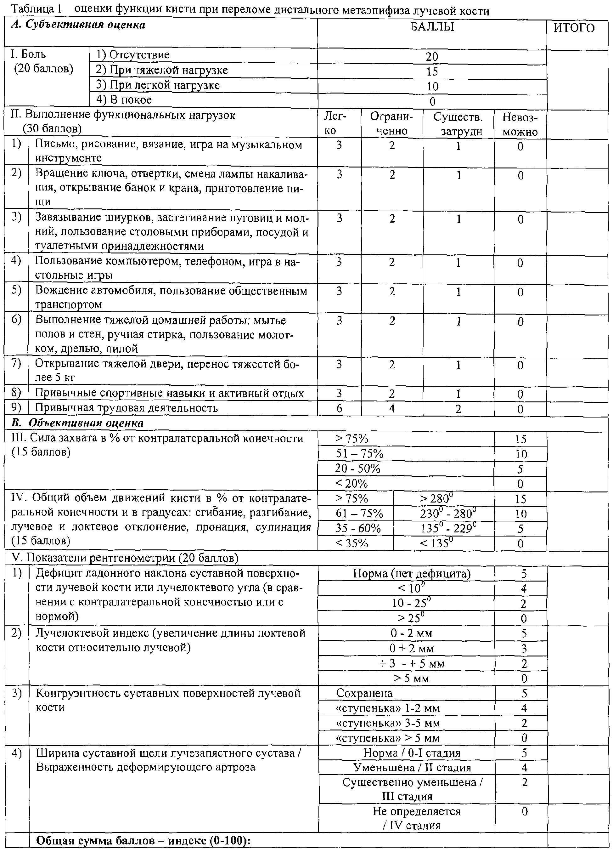 Способ оценки функции кисти при переломе дистального метаэпифиза лучевой кости и определения тактики лечения путем субъективной оценки, объективной оценки: силы захватов кисти, объема движений в кистевом суставе, наличие болевого синдрома и выраженность функциональных ограничений, а также показателей рентгенометрии, отличающийся тем, что наличие болевого синдрома определяют по следующим параметрам: боль: отсутствие – 20б.; при тяжелой нагрузке – 15б.; при легкой нагрузке – 10б.; в покое – 0б.; субъективную оценку осуществляют по результатам функциональных нагрузок: письмо, рисование, вязание, игра на музыкальном инструменте: легко – 3б.; ограниченно – 2б.; существенные затруднения – 1б.; невозможно – 0б.; вращение ключа, отвертки, смена лампы накаливания, открывание банок и крана, приготовление пищи: легко – 3б.; ограниченно – 2б.; существенные затруднения – 1б.; невозможно – 0б.; завязывание шнурков, застегивание пуговиц и молний, пользование столовыми приборами, посудой и туалетными принадлежностями: легко – 3б.; ограниченно – 2б.; существенные затруднения – 1б.; невозможно – 0б.; пользование компьютером, телефоном, игра в настольные игры: легко – 3б., ограниченно – 2б.; существенные затруднения – 1б.; невозможно – 0б.; вождение автомобиля, пользование общественным транспортом: легко – 3б.; ограниченно – 2б.; существенные затруднения – 1б.; невозможно – 0б.; выполнение тяжелой домашней работы: мытье полов и стен, ручная стирка, пользование молотком, дрелью, пилой: легко – 3б.; ограниченно – 2б.; существенные затруднения – 1б.; невозможно – 0б.; открывание тяжелой двери, перенос тяжестей более 5 кг: легко – 36.; ограниченно – 2б.; существенные затруднения – 1б.; невозможно – 0б.; привычные спортивные навыки и активный отдых: легко – 3б.; ограниченно – 2б.; существенные затруднения – 1б.; невозможно – 0б.; привычная трудовая деятельность: легко – 6б.; ограниченно – 4б.; существенные затруднения – 2б.; невозможно – 0б.; объективную оценку определяют в баллах по следующим параметрам: сила захвата в % от контралатеральной конечности: более 75% – 15б.; 51-75% – 10б.; 20-50% – 5б.; менее 20% – 0б.; общий объем движений кисти в % от контралатеральной конечности в градусах: сгибание, разгибание, лучевое и локтевое отклонение, пронация, супинация: более 75% и более 280° – 15б.; 61-75% и 230-280° – 10б.; 35-60% и 135-229° – 5б.; менее 35% и менее 135° – 0б.; результаты рентгенометрии оценивают следующим образом: дефицит ладонного наклона суставной поверхности лучевой кости или лучелоктевого угла в сравнении с контралатеральной конечностью или с нормой: норма, нет дефицита – 5б.; менее 10° – 4б.; 10-25° – 2б.; более 25° – 0б.; лучелоктевой индекс, увеличение длины локтевой кости относительно лучевой: 0-2 мм – 5б.; 0+2 мм – 3б.; +3-+5 мм – 2б.; более 5 мм – 0б.; конгруэнтность суставных поверхностей лучевой кости: сохранена – 5б.; “ступенька” 1-2 мм – 4б.; “ступенька” 3-5 мм – 2б.; “ступенька” более 5 мм – 0б.; соотношение ширины суставной щели лучезапястного сустава к выраженности деформирующего артроза: норма – 0-1 стадия – 5б.; уменьшена – II стадия – 4б.; существенно уменьшена – III стадия – 2б.; не определяется – IV стадия – 0б.; далее суммируют полученные баллы, и если общая сумма баллов составляет меньше 55 функцию кисти считают плохой, показания к оперативному вмешательству являются абсолютными, при сумме баллов от 55 до 69 функ