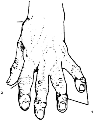 На чертеже показана кисть руки с деформированными суставами: 1 – узлы Гебердена, 2 – узлы Бушара.