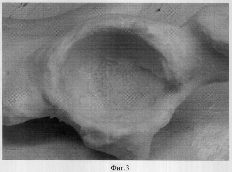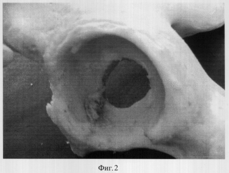 Во время оперативного вмешательства производится доступ к тазобедренному суставу. После удаления нестабильного вертлужного компонента эндопротеза, иссечения и удаления рубцов, спаек, измененных тканей, определяется локализация и размеры дефекта, проводится обработка вертлужной впадины фрезами до появления «капли росы» (фиг.2). С помощью пилы формируется трапециевидный трансплантат (равнобокая трапеция), так, чтобы одно основание было длиннее костного дефекта на 10 мм (измеряется диаметр дефекта кости в наиболее широком месте), другое основание длиннее на 20 мм. После моделирования трансплантат клином внедряется в дефект путем забивания, дополнительно вертлужную впадину выстилают аллокостной крошкой (фиг.3). Затем следует окончательная обработка вертлужной впадины фрезами и устанавливается вертлужный компонент.