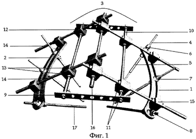 Врезные концы 17 резьбовых стержней 5 через кожные разрезы-проколы вводят в область передне-нижних остей (по одному стержню с каждой стороны), в крылья подвздошных костей (по одному-два стержня с каждой стороны) по направлению к надвертлужной области до контакта с противоположным кортикальным слоем. Количество вводимых резьбовых стержней 5 определяется характером повреждения костей таза (4 – при переломах типа В, 6 – при переломах типа С). Натяжные концы 4 резьбовых стержней 5 жестко крепят к полудугам 1, 2 тазовой опоры при помощи конических 6 и сферических 7 шайб и фиксирующих гаек 8. Плоскости расположения полудуг 1, 2 приближают к фронтальной с формированием между ними угла, открытого кнутри. Следующим этапом производят монтаж репозиционного узла 3. К полудугам 1, 2 тазовой опоры жестко крепят кронштейны 15 с резьбовым хвостовиком. Кронштейны 15 противоположных сторон соединяют между собой при помощи продольных 10 и поперечных 14 резьбовых штанг М 8, планок 9 с отверстиями, соединительных элементов 12 со взаимоперпендикулярными отверстиями 13 и регулирующих гаек 11 таким образом, что репозиционный узел 3 приобретает форму треугольной призмы с основанием, обращенным кнутри, и имеет четыре рычага воздействия на костные фрагменты.