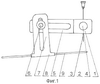 Схематическое изображение предложенного устройства и способа проведения спиц при оперативном лечении поперечной распластанности стопы представлено на чертежах (Фиг.1-4). Фиг.1 – вид устройства сбоку, фиг.2 – вид устройства сверху, фиг.3 – вид устройства в аксонометрической проекции, фиг.4 – схема способа проведения спиц Киршнера через первую и вторую плюсневые кости с помощью устройства.