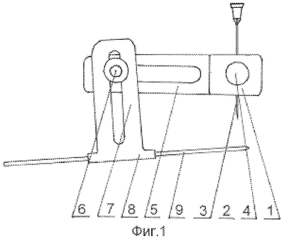 Сущность изобретения: предложено устройство (Фиг.1-3), состоящее из корпуса 1, выполненного в виде прямоугольного параллелепипеда, в центре которого имеется отверстие 2 в диаметре 1 мм. для прохождения иглы 3 (например инъекционной). На боковой поверхности корпуса в горизонтальной плоскости имеется резьбовое отверстие, идущее к его центру, в котором находится винт 4, при плотном закручивании которого игла, находящаяся в корпусе, фиксируется в неподвижном положении. Непосредственно к корпусу крепятся две планки 5, расположенные под некоторым углом друг к другу, имеющие продольные отверстия. К планкам с помощью винтовых шарниров 6 закреплены подвижные планки 7 также с продольными отверстиями, имеющие на концах направители для спиц 8, выполненные в виде полых трубок диаметром до 2 мм. Устройство позволяет с помощью шарниров, а также продольных отверстий в планках изменять положение направителей спиц в вертикальной плоскости.