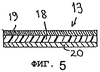 Второй вариант реализации изобретения раскрыт на фиг.4 и 5, на которых отдельные полоски 13, покрытые клеящим веществом, используются вместе с изделиями для обкладывания операционного поля 14-17 для осуществления аналогичного размещения изделий для обкладывания операционного поля вокруг операционной области О на фиг.1. Полоски 13 предпочтительно состоят из пластиковой пленки 18, которая на ее верхней стороне покрыта клеящим веществом 19, хорошо прилипающим к материалу изделия для обкладывания операционного поля, например акрилатным клеем, и на ее нижней стороне покрыта клеящим веществом 20, прилипающим к коже. Клеящее вещество 20 представляет собой клей, имеющий такие же свойства, как клей 12 в варианте реализации, описанном выше со ссылкой на фиг.1 и 2. Следовательно, изделия для обкладывания операционного поля 14-17 лишены клеящего покрытия. При процедуре обкладывания операционного поля хирургическими простынями с помощью такой комбинации изделия для обкладывания операционного поля и полоски полоску сначала накладывают вдоль края операционного поля О, после чего край изделия для обкладывания операционного поля накладывают на полоску и, посредством этого, фиксируют к клеящему веществу 20 полоски. Благодаря тому обстоятельству, что изделие для обкладывания операционного поля лишено клеящего покрытия, которое прилипает к изделию или нежелательным частям тела пациента, очень легко манипулировать таким изделием для обкладывания операционного поля и накладывать его на уже фиксированную полоску. Несмотря на то что данное размещение представляет собой двухстадийную процедуру, наложение изделия для обкладывания операционного поля облегчено в такой степени, что время для наложения будет не дольше, чем для наложения изделий для обкладывания операционного поля, имеющих интегрированный клеящий край. На фиг.4 обкладывание операционного поля изделиями для обкладывания операционного поля 14-17 показано на конечном этапе, при котором остается только произвести фиксацию края изделия для обкладывания операционного поля 16 к полоске 13.