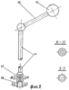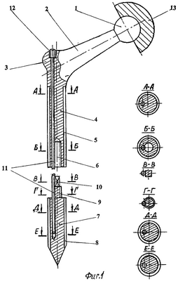 Устройство для установки эндопротеза тазобедренного сустава выполнено в виде стержня 14 с ручкой 15, отклоненной от оси стержня 14 на величину шеечно-диафизарного угла эндопротеза. На свободном конце ручки 15 размещена сферическая головка 16, а на конце стержня 14 – цилиндрическая обойма 17. В ней выполнено гладкостенное гнездо 18, соответствующее по форме и габаритам наружному диаметру резьбы резьбового стержня 9, а также форме и габаритам выступа квадратного сечения 10.