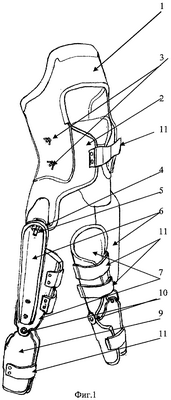 В настоящее время известны различные приспособления для восстановления опорно-двигательных функций различных отделов костно-мышечной системы человека. Практически все известные ортопедические приспособления для лечения патологий нижних конечностей представляют собой так называемый “внешний скелет”, защищающий функцию мышц и капсульно-связочного аппарата суставов конечностей. Так, в патенте США N 5658242 описано приспособление для облегчения опорно-двигательных функций нижних конечностей, содержащее поясничный опорный элемент (бандаж), соединенный через упруго-эластичную связь с голеностопными опорными бандажами и опорными бандажами для бедра. Указанные бандажи соединены между собой жесткими тягами, имеющими в своей средней части на уровне коленного сустава шарнирное соединение.