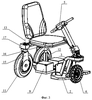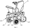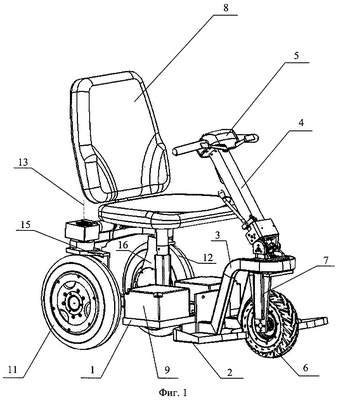 Трехколесное транспортное средство имеет в своем составе рамную несущую конструкцию 1 с подножками 2, опорой 3 рулевой колонки 4, закрепленной с обеспечением возможности изменения угла ее наклона. На рулевой колонке 4 имеется пульт 5 управления транспортным средством. Переднее колесо 6 закреплено на опоре, которая выполнена в виде вилки 7 с вертикальной или близкой к вертикальной осью поворота. Переднее колесо может быть ведущим и выполнено в виде, например, мотор-колеса. На несущей конструкции установлено кресло 8, под сиденьем которого расположены источники питания приводов – аккумуляторы 9. На задней части несущей конструкции на кронштейне 10 закреплены приводы поворота задних колес 11, 12 вокруг вертикальных осей 13 и 14 соответственно. Опорами задних колес могут служить стойки 15, 16, выполненные в виде Г-образно изогнутых пластин или балок, горизонтальная полка каждой из которых неподвижно соединена с вертикальным выходным валом своего редуктора 17 поворота, приводимого в движение электродвигателем 18. На вертикальной полке каждой стойки закреплено колесо: либо его ось, если колесо не является ведущим, либо двигатель колеса, если колесо является ведущим, т.е. мотор-колесом. Таким образом, между приводом поворота каждого заднего колеса имеется шарнирная связь с опорой колеса, имеющей вертикальную осью поворота. Опора каждого заднего колеса может быть выполнена в виде вилки, например, как для переднего колеса, или в виде кронштейна, или в любом другом приемлемом конструкционном виде. Переднее колесо 6 может не иметь рулевой колонки, а управляться от пульта управления, например, с джойстиком, закрепленным на подлокотнике кресла.