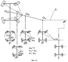 Как видно из приведенных иллюстрирующих примеров, в отличие от обычного транспортного средства, осуществляющего поворот, как это показано на позиции II (проекции горизонтальных осей вращения всех колес на опорную поверхность сходятся в одной точке, являющейся центром поворота транспортного средства, при этом угол между указанными проекциями для задних колес равен нулю), в заявляемом устройстве этот угол отличен от нуля. В предельном случае, когда вращение осуществляется вокруг центра Оmin, угол максимален. Однако возможно, а иногда желательно осуществлять поворот, когда центр вращения, хотя и находится на проекции на опорную поверхность продольной плоскости симметрии транспортного средства, но не совпадает с центром Оmin, а отстоит от вертикальной оси поворота переднего колеса на расстоянии L, которое задается интервалом L=(0,1÷0,9)Н, где Н – колесная база. Для четырехколесного средства возможный, а иногда желательный режим, когда центр поворота также находится на проекции на опорную поверхность продольной плоскости симметрии транспортного средства, но отстоит от проекции на опорную поверхность плоскости расположения вертикальных осей поворота передних колес на расстоянии М, которое определяется следующим соотношением М=(0,1÷0,9)Н, где Н – колесная база
