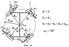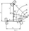 Более подробно сущность изобретения раскрывается в приведенных ниже примерах реализации и иллюстрируется чертежами, на которых представлено: Фиг.1 – трехколесное транспортное средство, общий вид, Фиг.2 – мотор-колесо с приводом, Фиг.3 – трехколесное транспортное средство, движение боком, Фиг.4 – трехколесное транспортное средство, разворот на месте, Фиг.5 – четырехколесное транспортное средство, общий вид, Фиг.6 – четырехколесное транспортное средство, движение боком, Фиг.7 – четырехколесное транспортное средство, разворот на месте, Фиг.8 – трехколесное транспортное средство, схема поворота колес для движения вперед бортом (движение «крабом»), Фиг.9 – четырехколесное транспортное средство, схема поворота колес для движения «крабом», Фиг.10 – трехколесное транспортное средство, схема установки колес для поворота транспортного средства, Фиг.11 – четырехколесное транспортное средство, схема установки колес для поворота транспортного средства, Фиг.12 – трехколесное транспортное средство, возможные положения центра поворота, Фиг.13 – трехколесное транспортное средство, изменение положения центра поворота для разворота на месте, Фиг.14 – позиция IV на Фиг.13, увеличено, Фиг.15 – позиция V на Фиг.13, увеличено, Фиг.16 – четырехколесное транспортное средство, изменение положения центра поворота, Фиг.17 – позиция IV на Фиг.16, увеличено, Фиг.18 – позиция V на Фиг.16, увеличено, Фиг.19 – поясняющий чертеж к определению зависимостей угла поворота трехколесного транспортного средства.