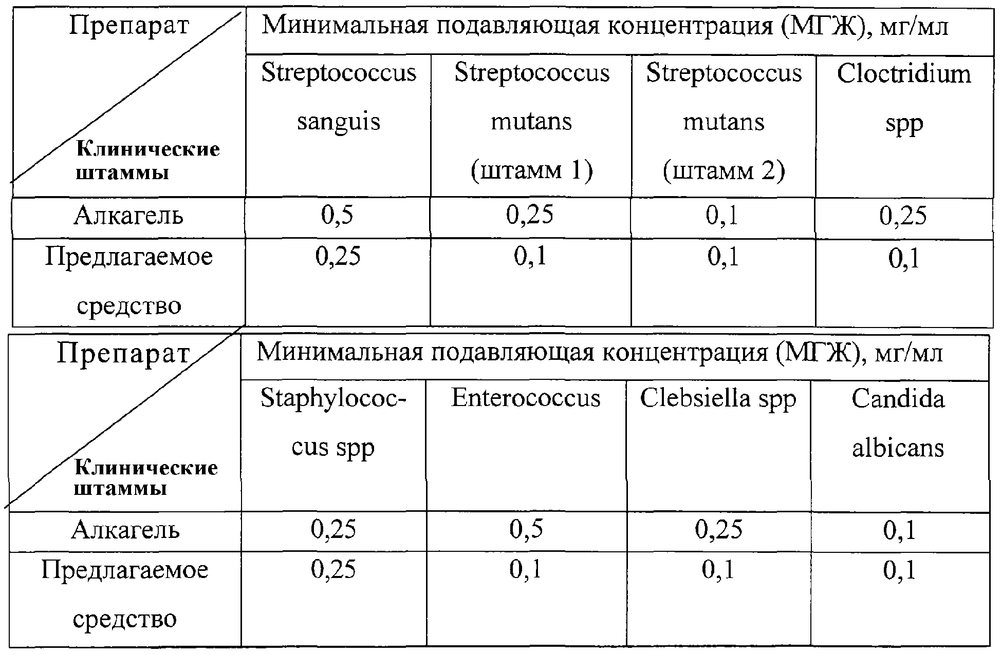 Квасцы алюмокалиевые обладают противовоспалительным, гемостатическим, антисептическим, моюще-очищающим свойствами, а так же оказывает вяжущий эффект. N-цетилпиридиния хлорид обладает антисептическим свойством. N-цетилпиридиния хлорид является четвертичным аммониевым соединением, относится к катионовым сурфактактам. Обладает противомикробной активностью в отношении грамположительных и в меньшей степени грамотриицательных бактерий. Не влияет на споры бактерий. Обладает вариабельной противогрибковой активностью, эффективен в отношении некоторых вирусов. Предназначен для местного применения при кожных заболеваниях, легких инфекциях полости рта и горла (Регистр лекарственных средств России. Субст. №74/614/15; №95/335/325, 29.11.95). Сочетание квасцов алюмокалиевых и N-цетилпиридиния хлорида приводит к потенцированию антисептического действия. Антисептические свойства препарата «Алкагель» и предлагаемого препарата подтверждены в исследовании антимикробной активности микрокассетным методом к клиническим штаммам патогенной микрофлоры полости рта: Исследование проводилось на кафедре микробиологии МГМСУ. Препарат получают следующим образом: квасцы алюминия и N-цетилпиридиния хлорид перемешивают в дисциллированной воде в предложенных соотношениях посредством вакуумного смесителя до получения однородного раствора, после чего в полученную композицию вводят гелеобразователь.