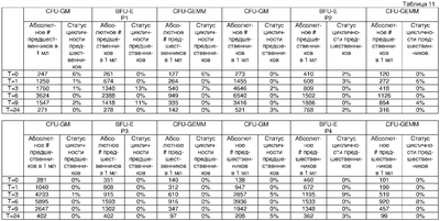 Используемый в описании термин “клетки-предшественники” относится к клеткам, которые в ответ на стимул могут образовывать дифференцированные гемопоэтические или миелоидные клетки. Присутствие клеток-предшественников можно определять в образце по способности клеток образовывать колониеобразующие единицы различных типов, например CFU-GM (колониеобразующие единицы гранулоцита-макрофага); CFU-GEMM (колониеобразующие единицы гранулоцитов-эритроцитов-макрофагов-мегакариоцитов, полипотентные (КОЕГЭММ)); BFU-E (эритроидный предшественник, образующий «взрывообразные» колонии); HPP-CFC (высокопролиферативные потенциирующие колониеобразующие клетки) или другие типы дифференцированных колоний, которые можно получать в культуре, используя известные протоколы.